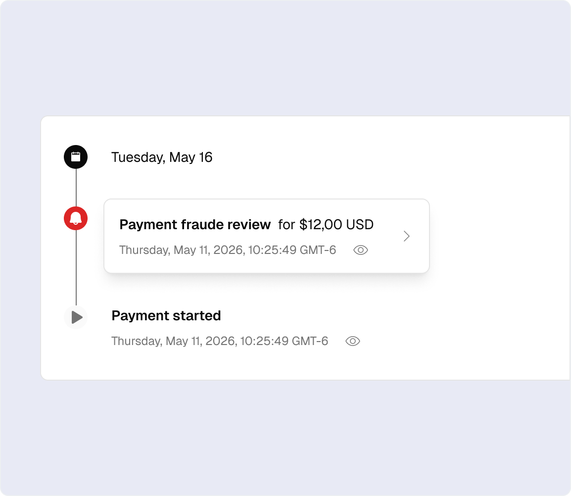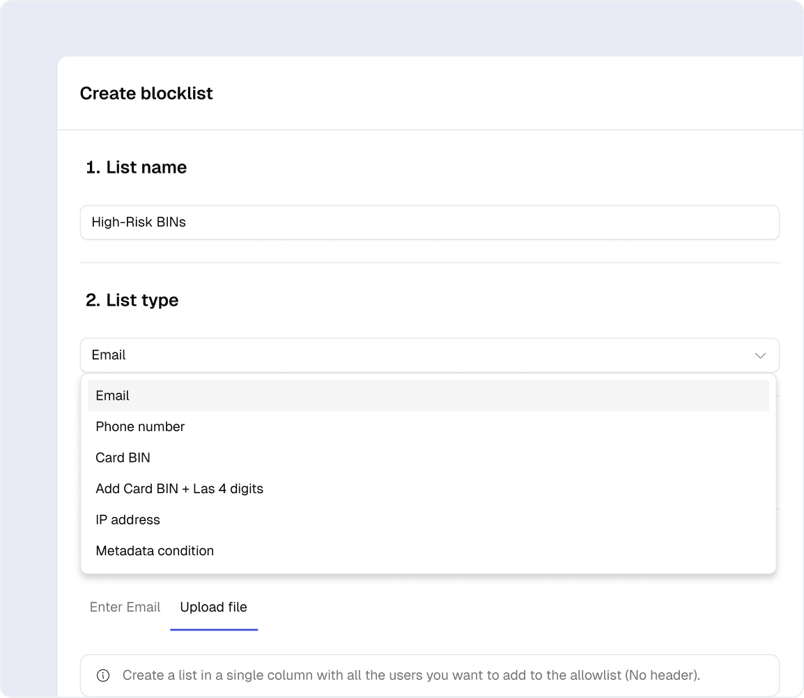 Crea listas de usuarios personalizadas para detectar y mitigar la actividad fraudulenta, mejorando tus estrategias de prevención del fraude. Utiliza listas de bloqueo para impedir los pagos de usuarios específicos en función de criterios como el correo electrónico, el número de teléfono, el BIN de la tarjeta o la dirección IP.