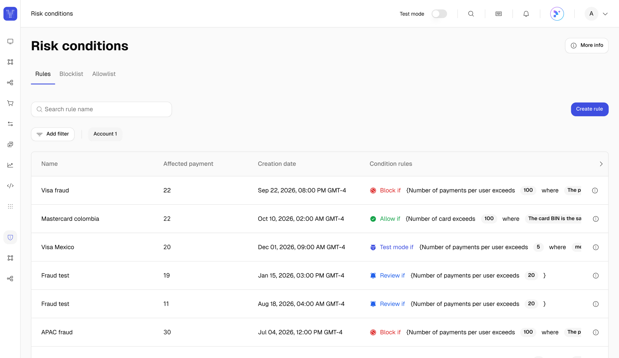 Además, aprovecha las listas de permitidos para permitir pagos de usuarios de confianza, pasando por alto el control de fraude o 3DS cuando sea necesario, totalmente personalizable para adaptarse a las preferencias del comerciante.