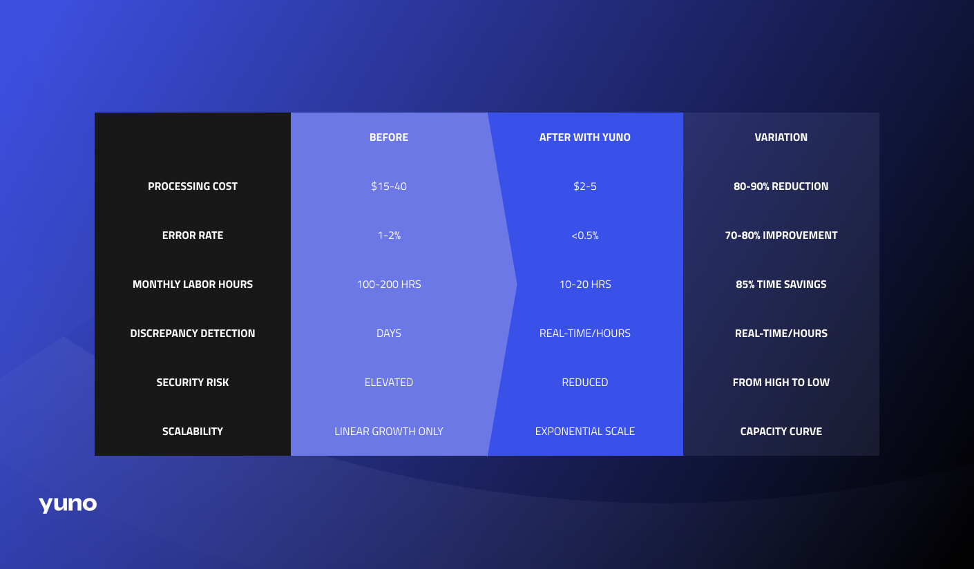 As transaction volumes climb, handoffs multiply. Each exception creates additional manual effort and introduces new opportunities for delays or errors. Payment reconciliation that took two hours per week on 1,000 transactions per month could require a full-time headcount at 50,000 transactions.